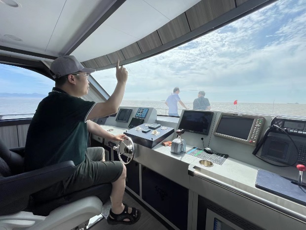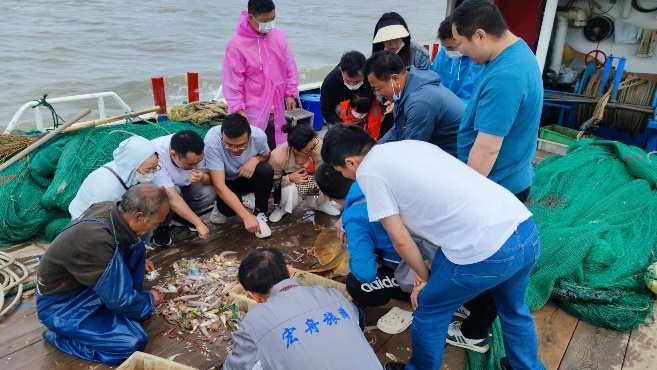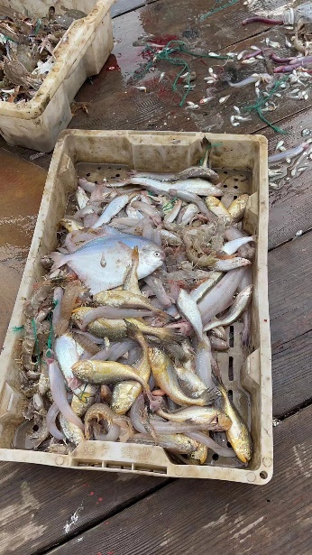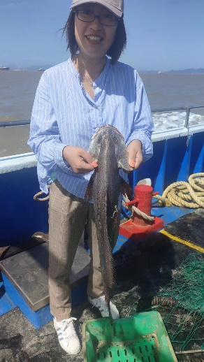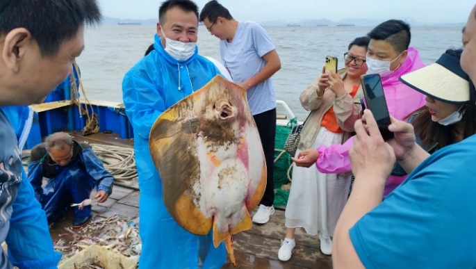 最让人难忘的节目总是压轴出场。28日5点钟的晨阳拉开了我们出海拖网的帷幕。渔船上红旗迎风飘扬,海浪时高时低,云彩浮动,海鸟相随,我们乘风破浪,出海做个渔民,晕船与拍照此时也能和平共处。半个时辰光景,船工大哥帮我们收了网,拉上一个巨大的、怪怪的鱼,还有很多很多鱼虾生鲜,头一次收获这么多海鲜,还有一个巨无霸,大家无比激动,个个蹲在甲板上围观,相机定格了此时的画面,真是一群三四十岁的“大孩子”……